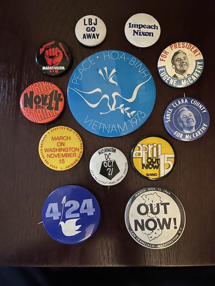 Personal collection of Vietnam era anti-war stickers and buttons. Many of the major events are represented: