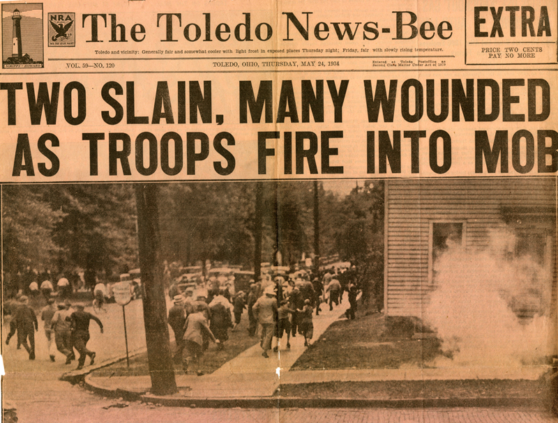 The ELECTRIC AUTO-LITE STRIKE took place in Toledo Ohio over union recognition and wages. The strike lasted nearly two months, during which occurred a brutal five-day pitch battle between some 6,000 strikers and the Ohio National Guard, leaving two striking workers dead and more than 200 injured. The highly publicized struggle happens at the height of the Great Depression and comes to be known as the Battle of Toledo. The strike is regarded by many labor historians as one of the most important strikes in U.S. history.