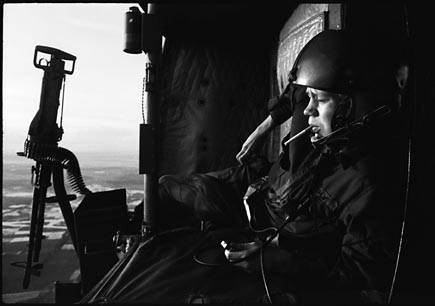 Roll 3674. UH-1 helicopter gunner about to light up as his aircraft heads for a rocket belt recon mission near Bien Hoa, Vietnam, which was hit by North Vietnamese rockets the night before. 721100.